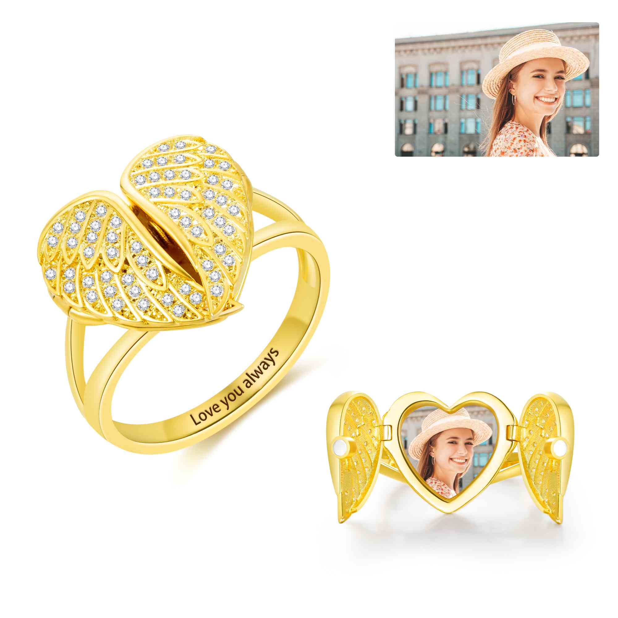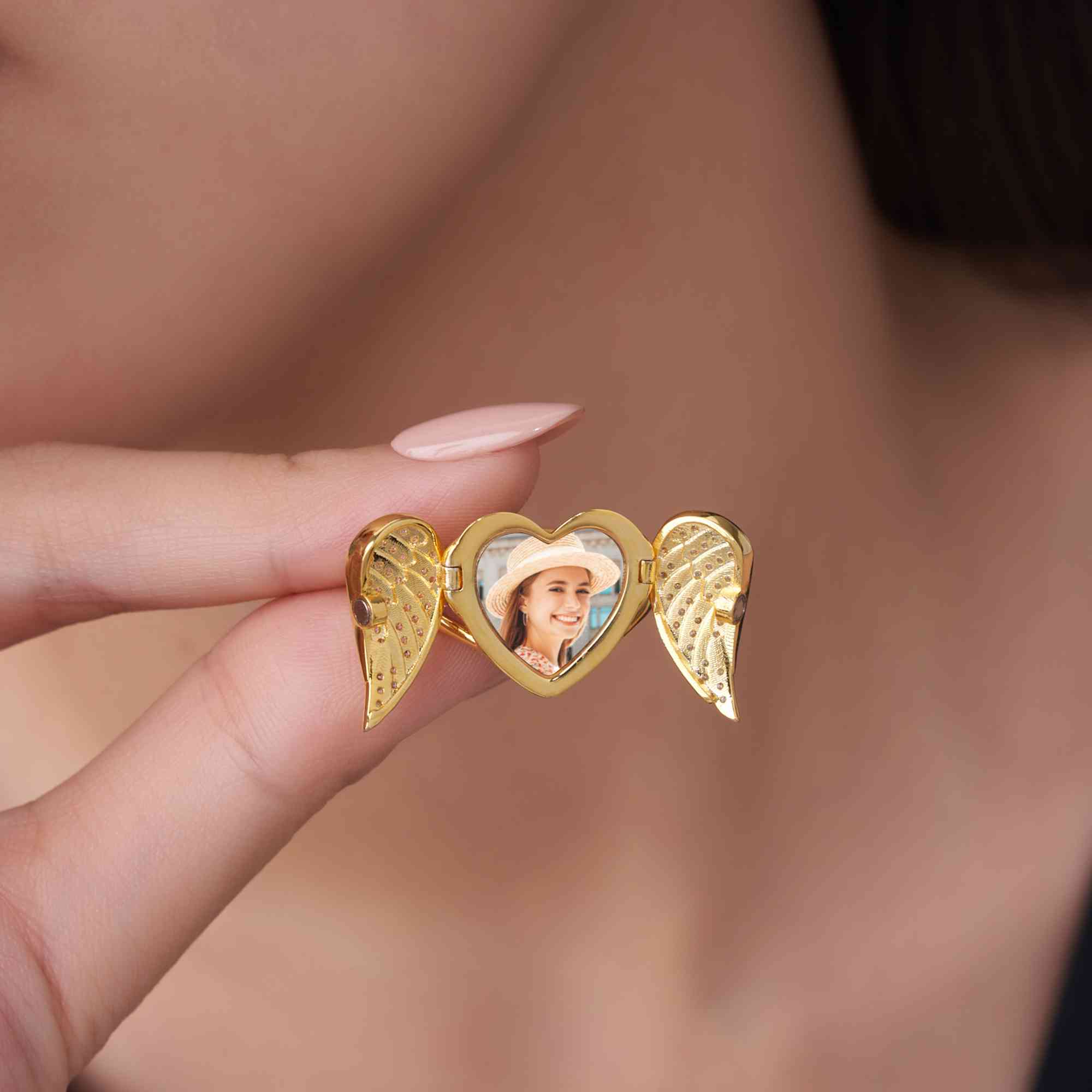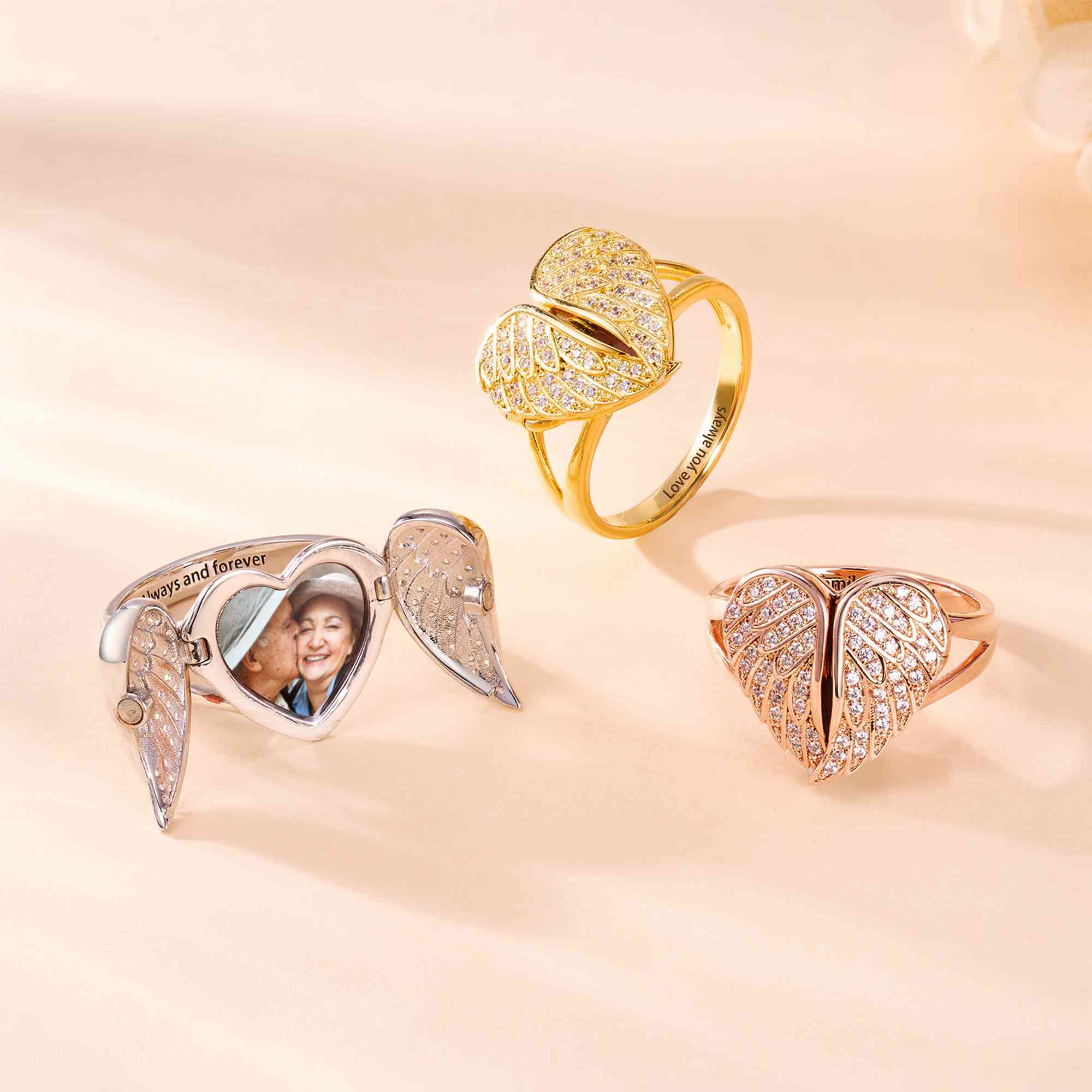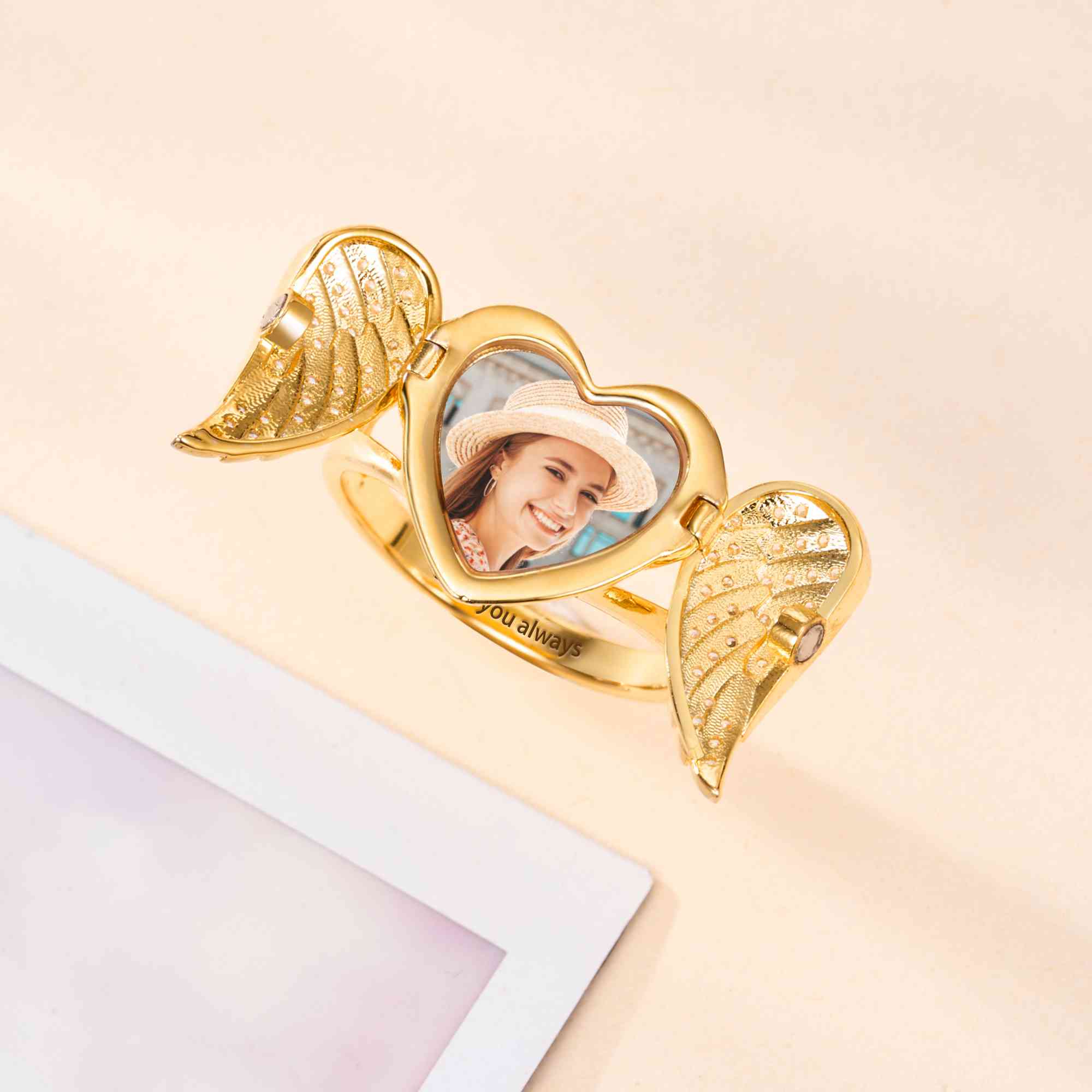 Unique Design - Choose your preferred plated color—gold, platinum, or rose gold—along with the material, then upload a special photo to be placed inside the heart locket and add an inner engraving. The heart paired with angel wings represents lasting love and protection, turning this ring into a meaningful keepsake that holds personal memories and emotions. It’s ideal for anyone who wants jewelry that reflects their own story.