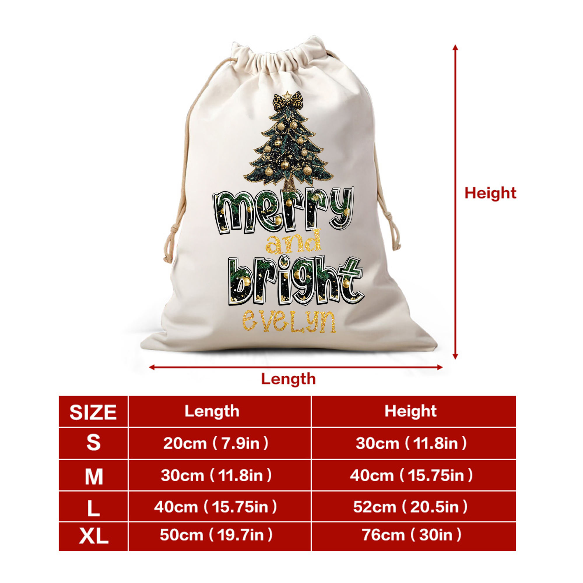 Merry and Bright Design - This personalized Christmas sack showcases a joyful “Merry and Bright” design with a sparkling bow Christmas tree and playful leopard prints. The chic and lively design adds a trendy twist to traditional holiday décor, perfect for both kids and adults who love a touch of fun and fashion in their celebrations.
